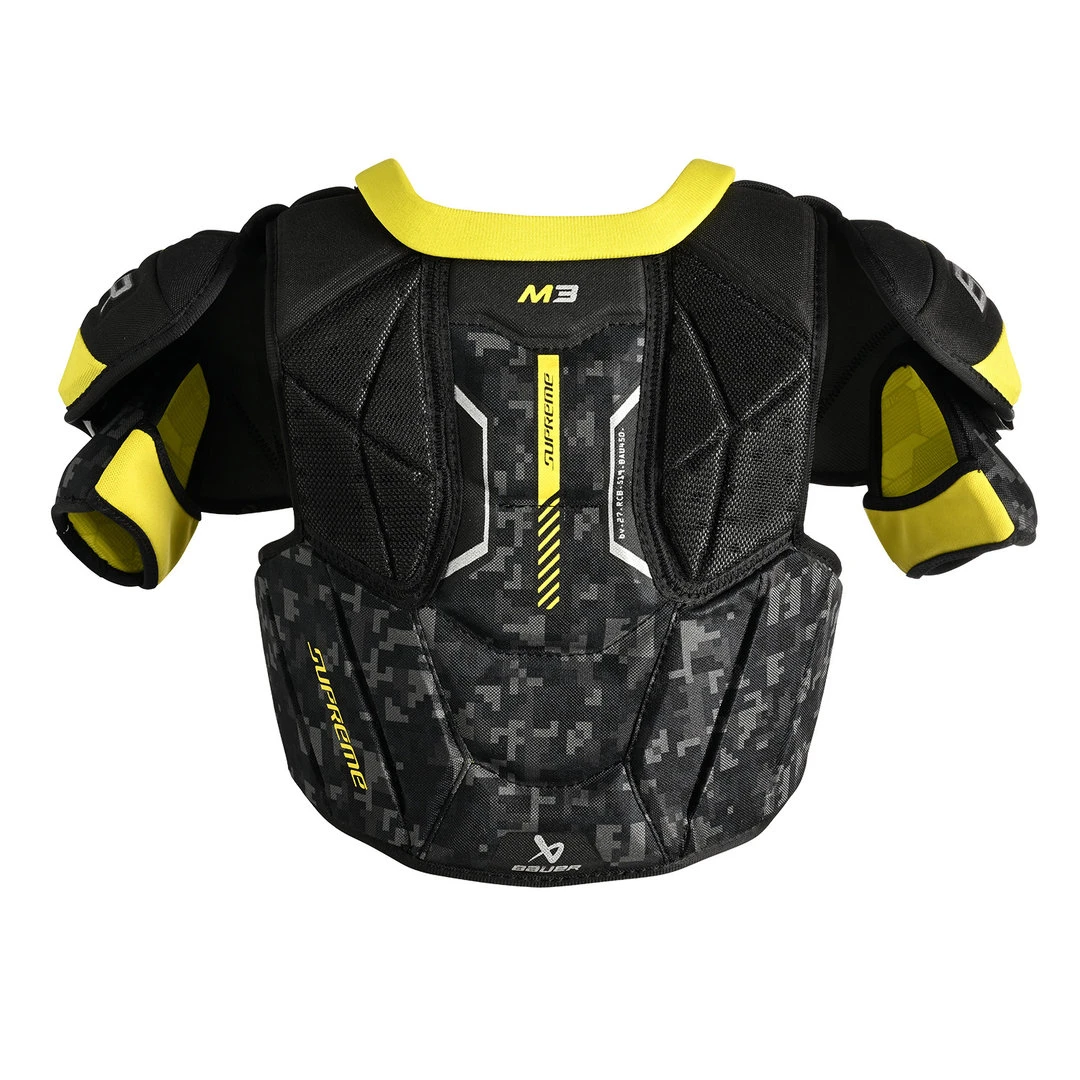 Beim Bauer Supreme M3 Schulterschutz sorgt das Upgrade des beweglichen Brustbereichs für eine noch bessere Passform und mehr Bewegungsfreiheit. Die Schulterkappen mit Low Profile AMP verrutschen nicht und bieten optimalen Schutz. Das bewegliche Brustbein sorgt für mehr Flexibilität. Der Bereich der Wirbelsäule ist mit einer PE Einlage ausgestattet, um den Rücken bestmöglich zu schützen. Der Oberarmschutz ist verstellbar und mit geformtem PE ausgestattet, um auch die Arme perfekt zu schützen.